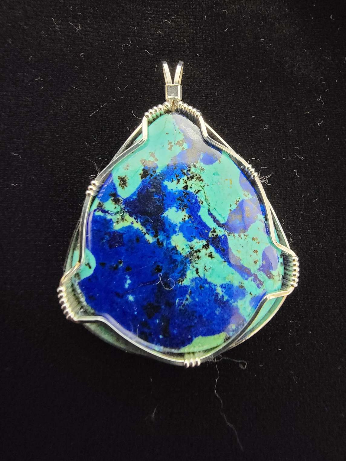 Bold Arizona azurite with deep cobalt-blue pools blending into bright teal and green, creating a dramatic pattern across the stone. Wrapped in polished sterling silver with smooth, flowing wirework that frames its broad, rounded triangular shape. Handmade.