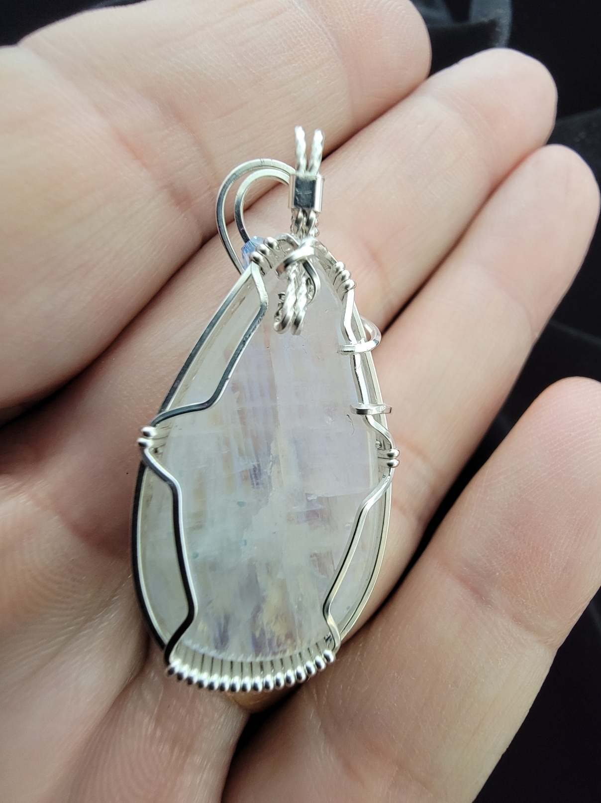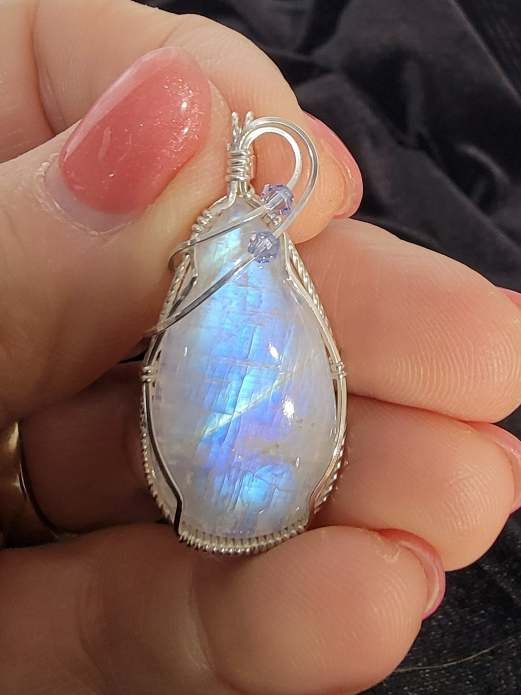 A luminous moonstone with a bright, shifting blue flash that moves across the surface in the light. Wrapped in polished sterling silver with elegant flowing curves and accented by soft blue crystal beads that complement the stone’s glow. Handmade.